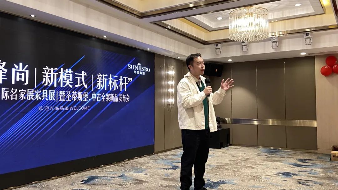 接下來,我們工業營銷部副經理吳天喜先生為我們重磅揭曉了2025春季新品中古全案系列和新古典全案升級新品,他從選材、設計、風格、工藝等方面進行了全面的講解,并提到此次中古新品的全案模式是以更具設計感的創新方式,給予消費者整體性的體驗感升級,助力大家在激烈的市場競爭中,突顯差異化的優勢,實現業績的飛躍式增長。