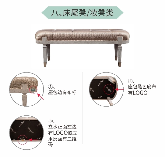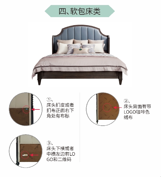 (1)床頭捫皮或者捫布正面右下角處有布標;